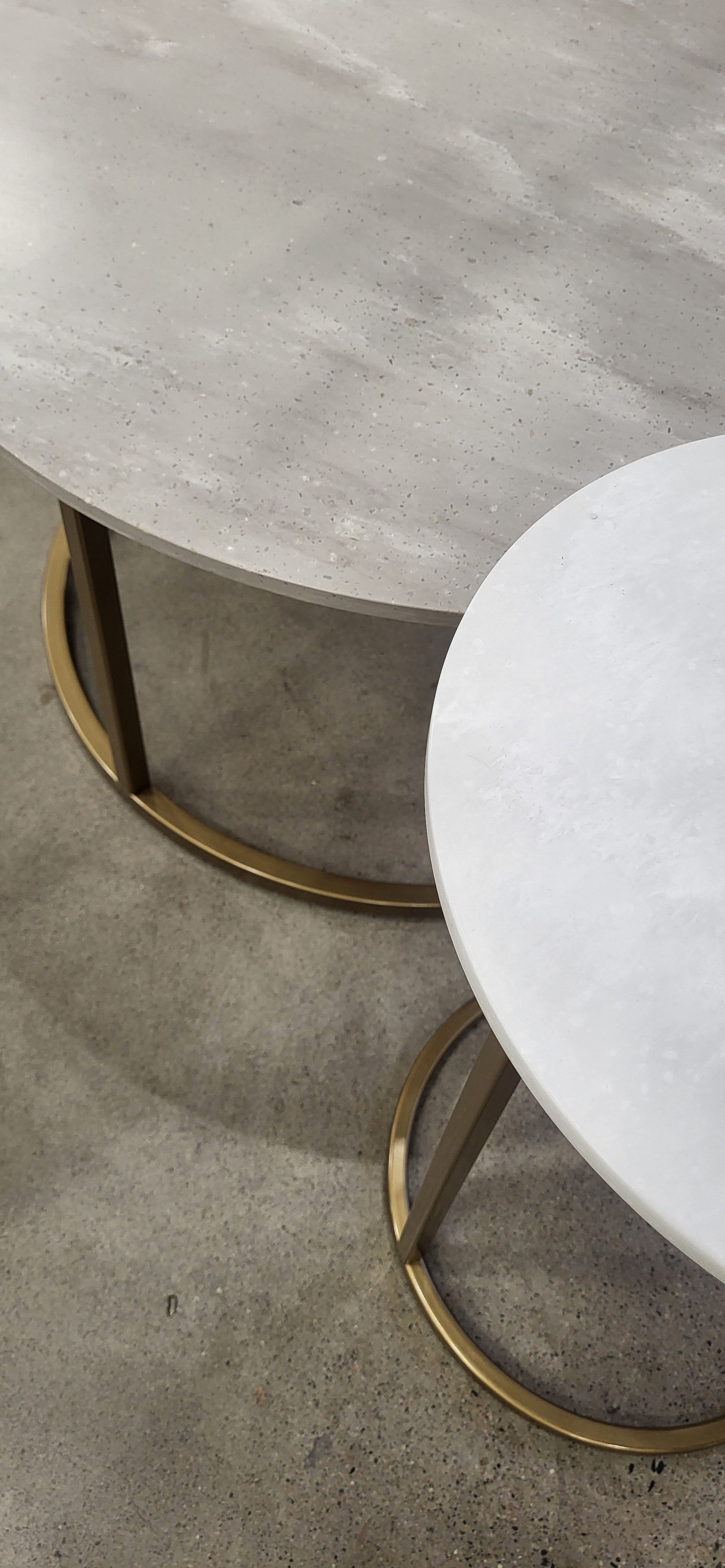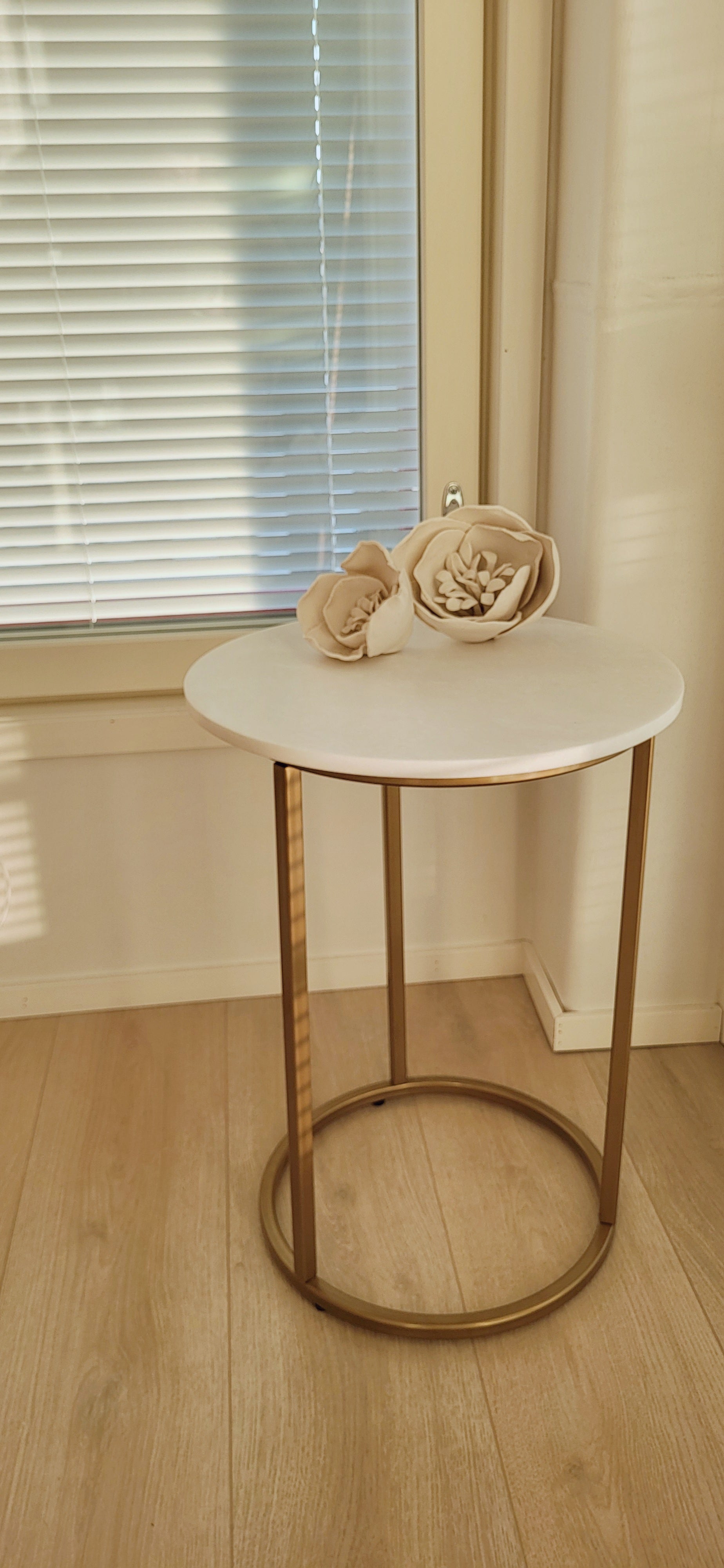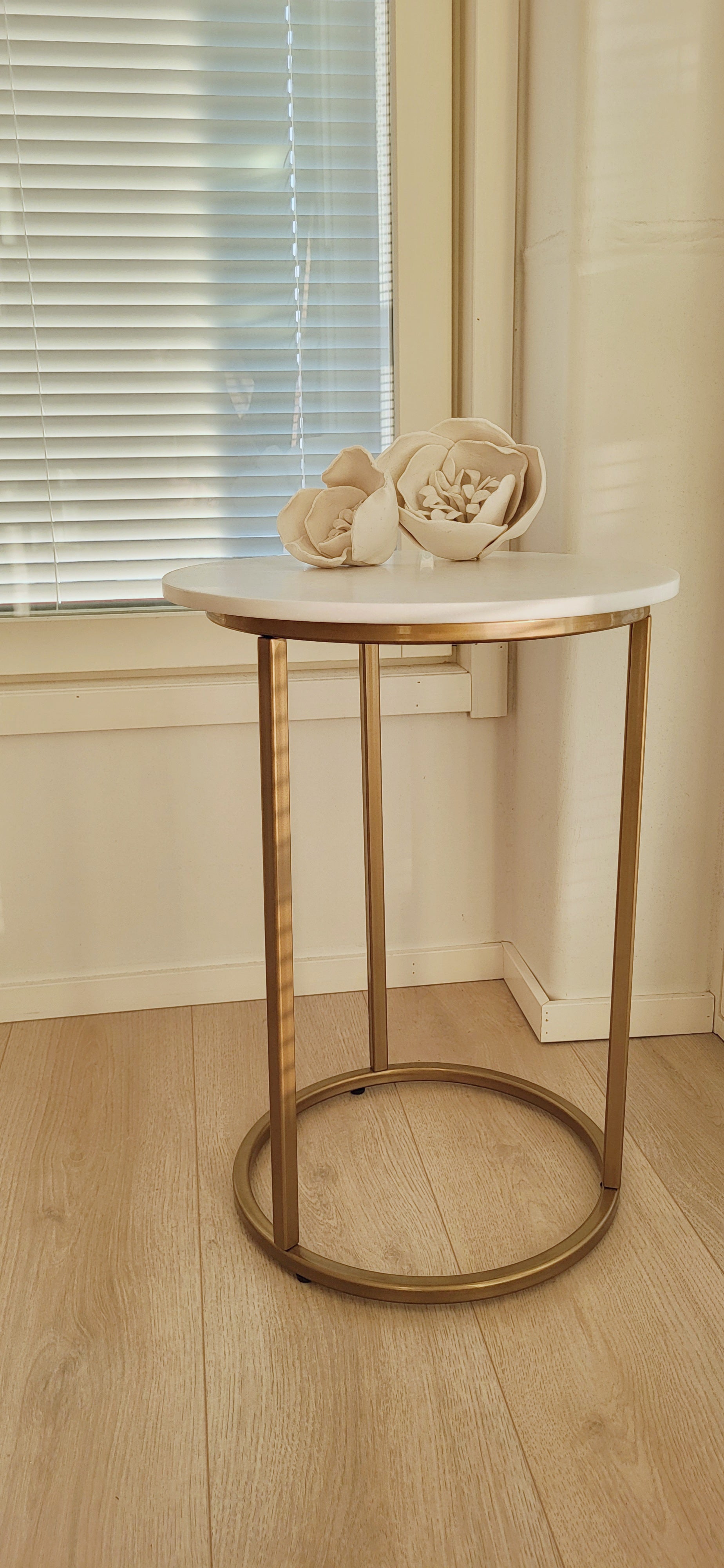 Selkeälinjainen, mutta näyttävä kivikomposiittipöytä metallijalalla, joka toimii täydellisenä sivupöytänä tai yöpöytänä. Pöydän kivikomposiittikansi tuo pintaan luonnollisen, rauhallisen ilmeen, kun taas metallijalka sävyssä vanha kulta lisää kokonaisuuteen lämpöä ja hienovaraista ylellisyyttä.