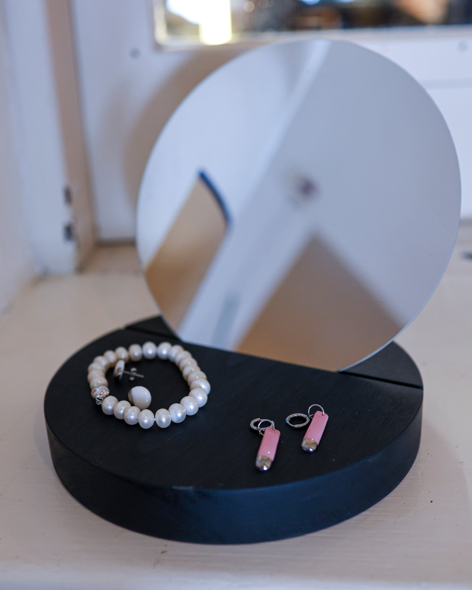 Kaksipuoleinen pyöreä peili asetetaan puujalustan uraan, jalusta toimii samalla kauniina tasopintana esimerkiksi koruille tai pienille esineille. Peili sopii täydellisesti niin eteiseen, makuuhuoneeseen kuin työpisteelle – tuoden tilaan valoa ja luonnonläheistä estetiikkaa.