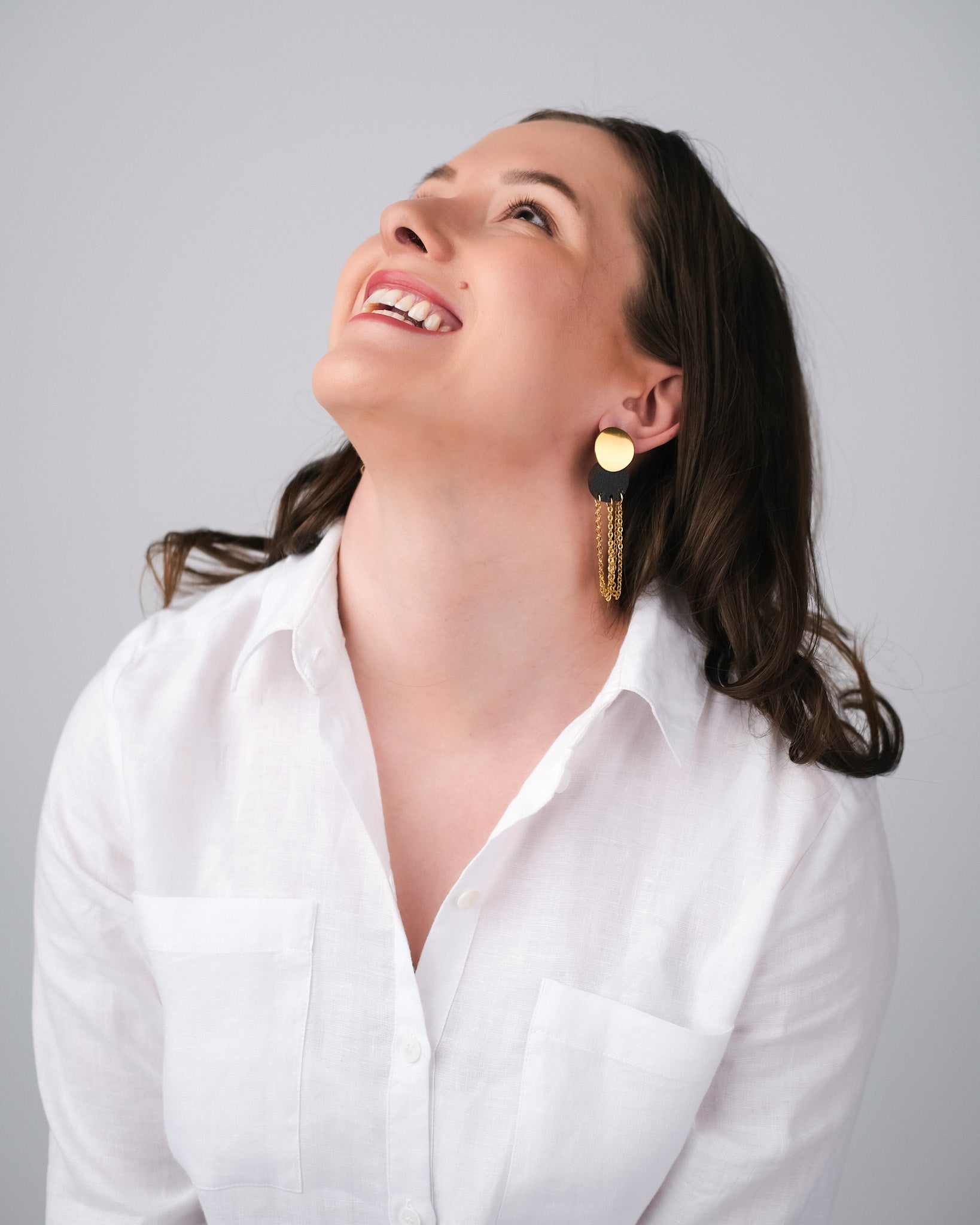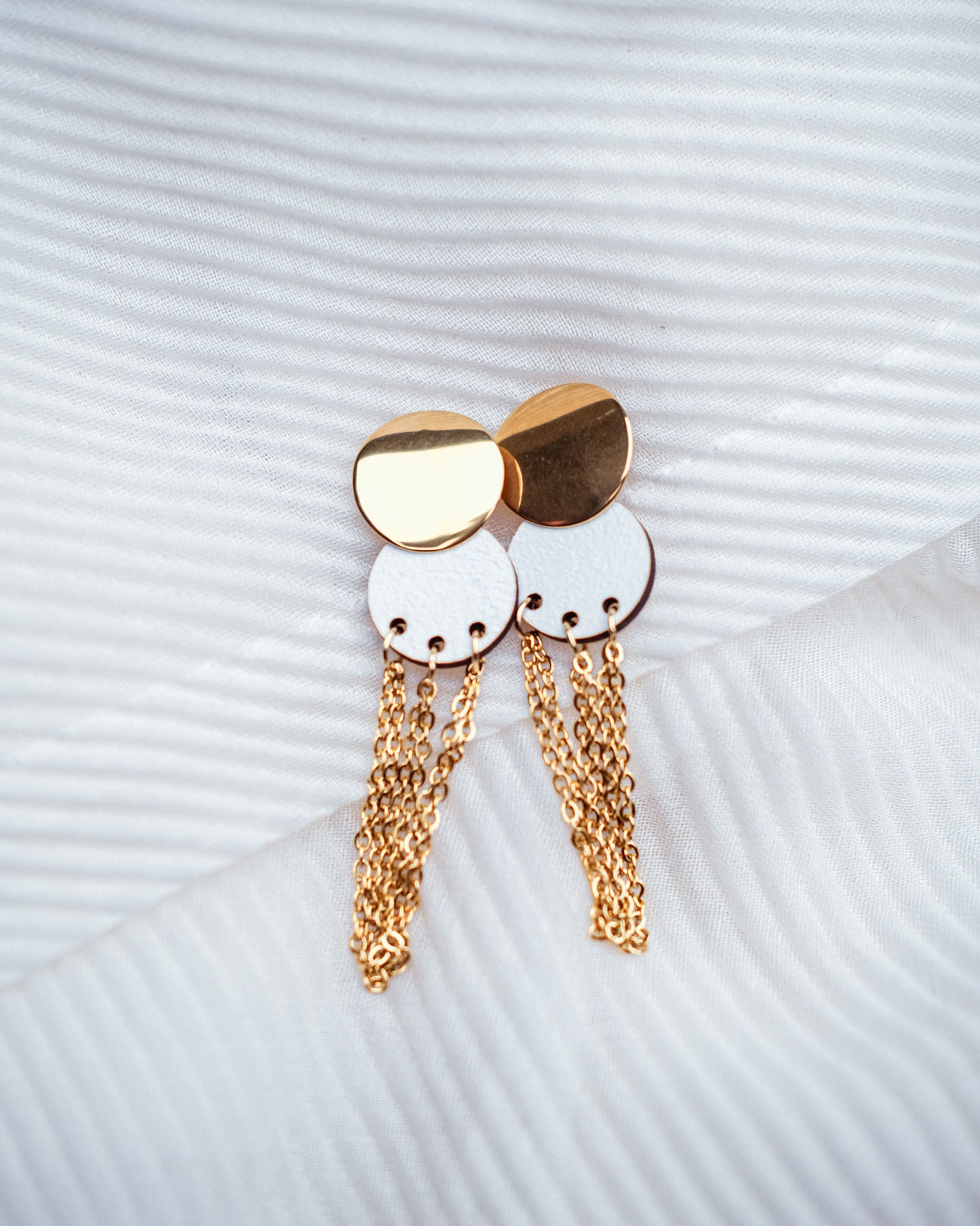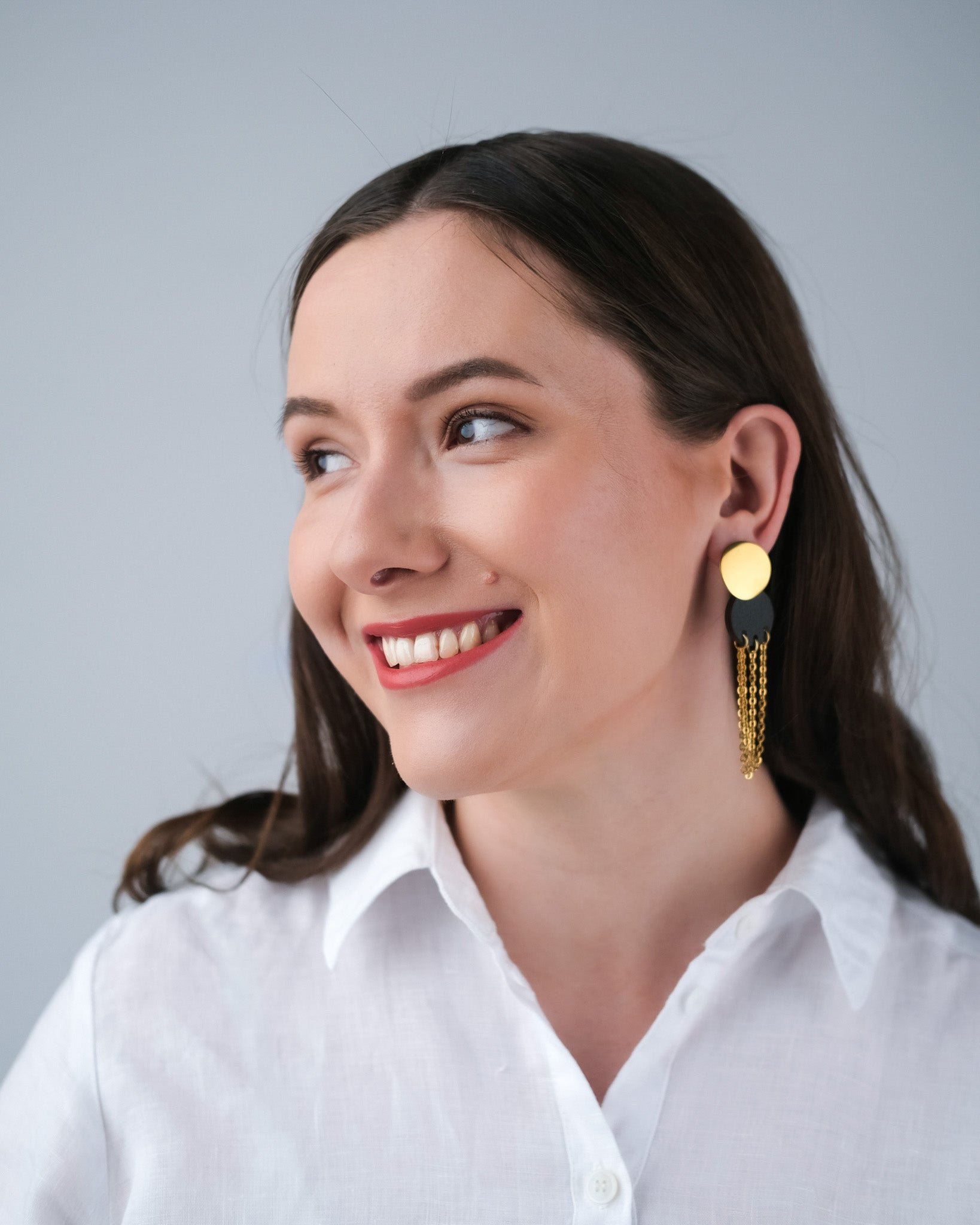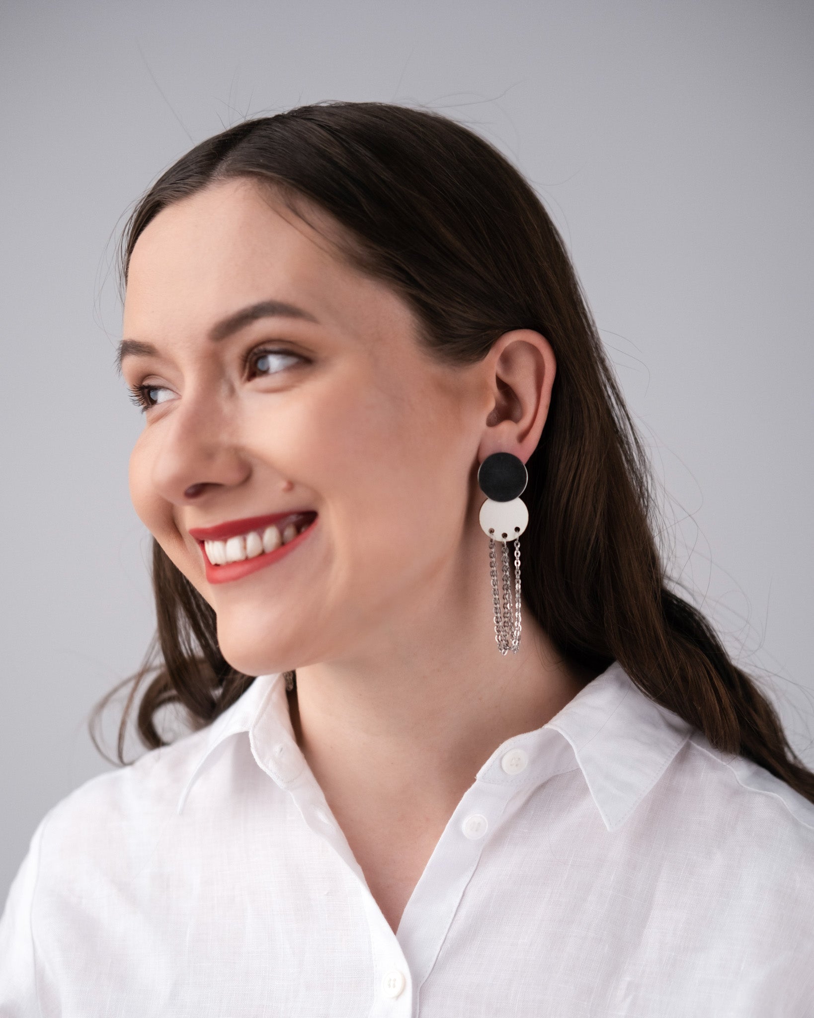 Tässä kauniissa korvakorussa suomalainen koivuvaneri yhdistyy ruostumattomasta teräksestä valmistettuun ketjuun.